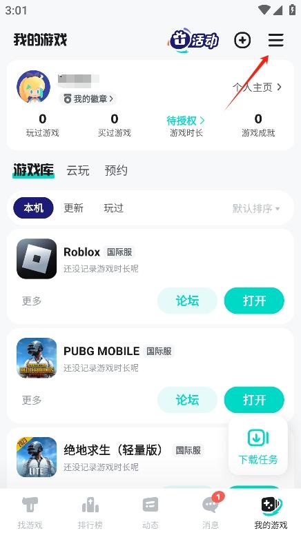 1、打开软件后,点击我的游戏,打开侧边栏;