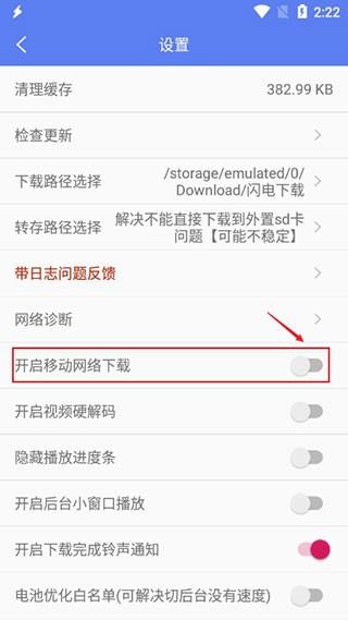 3、进入闪电下载APP的设置页面之后,点击“开启移动网络下载”后面的开关;