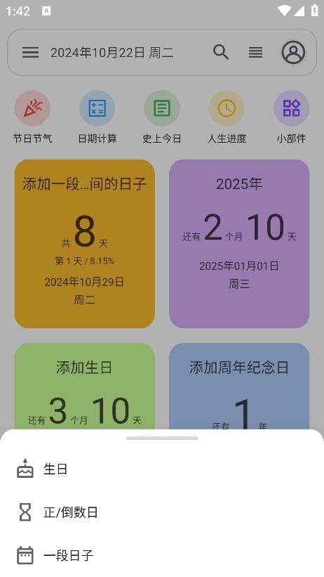 1、打开软件,点击右下角的添加,支持生日、正数日倒数日、一段日子的添加;