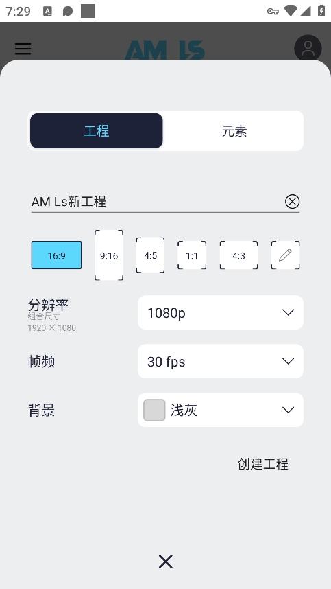 2、命名工程名字,选择画布大小,设定分辨率,帧率,背景等参数,然后点击创建工程;