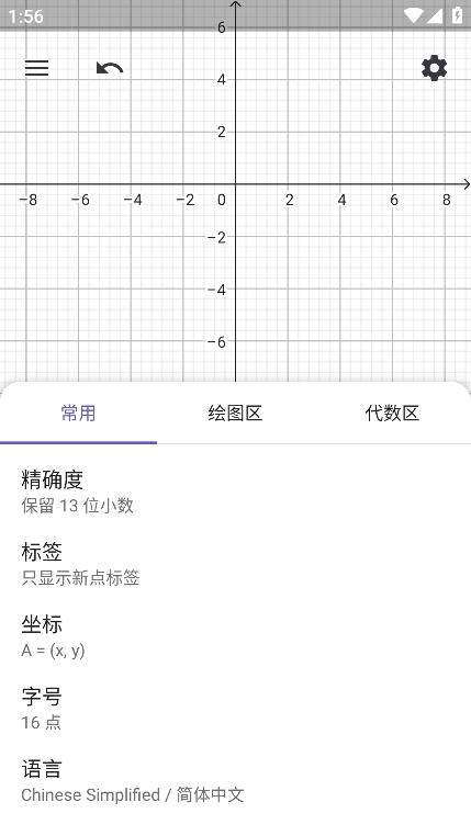 2、点击右上角的设置,可以进行常用、绘图、代数的设定;