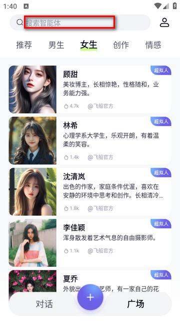 3、输入智能体名称,点击搜索,点击智能体进行互动。