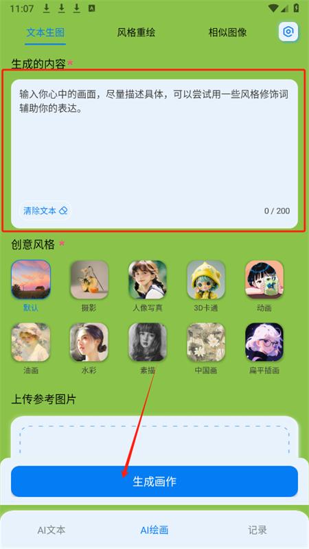 5、在AI绘画页面,输入你心中的画面,选择自己喜欢的风格等,点击生成画作即可。