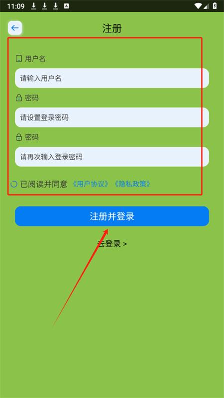 3、然后输入用户名,设置好自己登录密码,点击注册并登录即可。