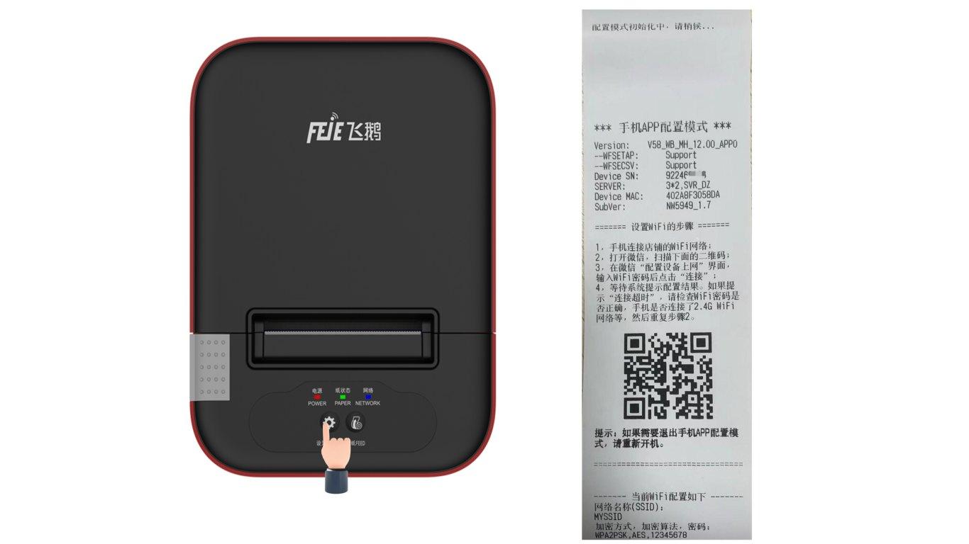 ①先把打印机关机,按住设置按键后,开机,小票提示“WiFi配置模式初始化中,请稍候···”松开设置按键,将打印一张新的配置小票;