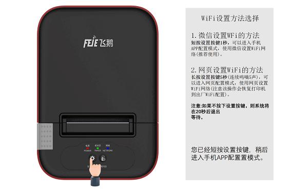 2、打印机开机,按一下打印机的设置按键,将打印出有“Wi-Fi设置方法选择”字样的小票