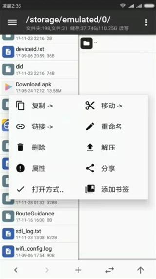 存储、书签:打开侧拉栏,可以看到存储器和书签。点击相应存储器可快速进入根目录、内部存储、外置存储等。书签需要自己添加,注意只有当你添加了书签后,才会在侧拉栏中看到书签分组。