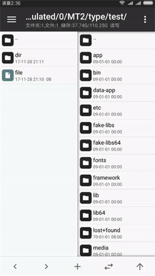 打开 MT 管理器后第一眼看到的就是它的左右两个操作窗口,该设计已经是 MT 的标志之一,与之对应的是双窗口操作模式。如果你是第一次使用,开始会不太适应,但相信我,等你花点时间来熟悉它后,你的操作效率会大大高于使用其它文件管理器。