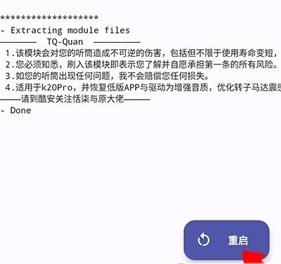 4、刷入完成之后点击右下角重启即可启用模块