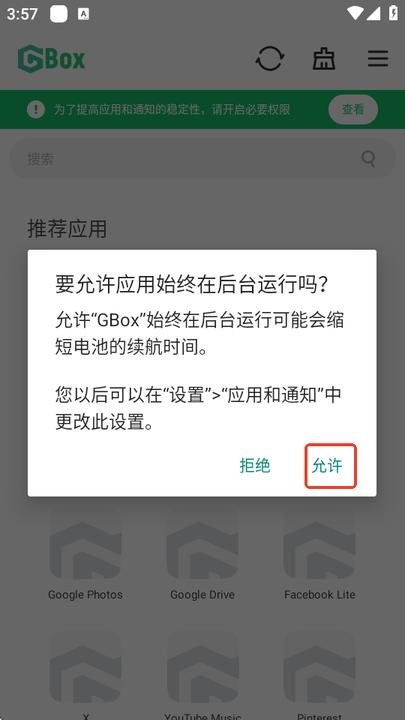 GBox 申请必要的权限以确保应用程序可以正常运行。例如,GBox申请通知权限,保证用户能够及时收到消息通知。