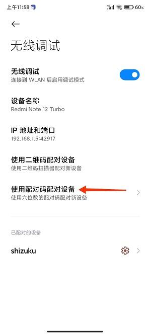 2.进去Shizuku操作为无线调试启动中【配对】-【开发者设置】-【无线调试】-【打开无线调试】-使用配对码配对设备