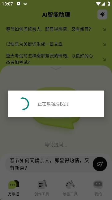 4、输入描述词,然后发送出去,稍等片刻如图所示,提示【正在唤起授权页】即刻就能获得答复。