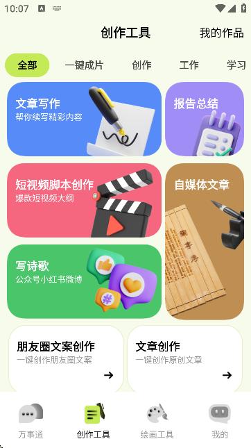 5、然后软件中还提供了大量的,实用且高效的智能创作工具。例如文章写作,短视频脚本创作,朋友圈文案创作等。