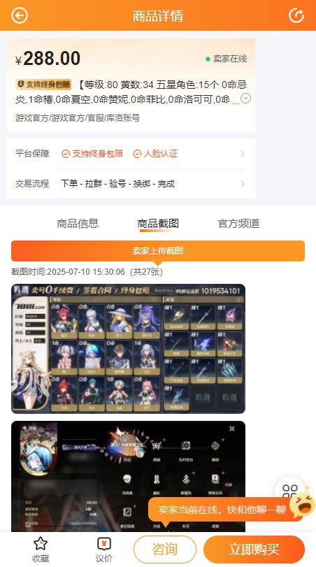 当您浏览到心仪商品时,可点击商品进入详情页面,查看商品详细描述、图片展示(如有)、卖家信用等级等信息。