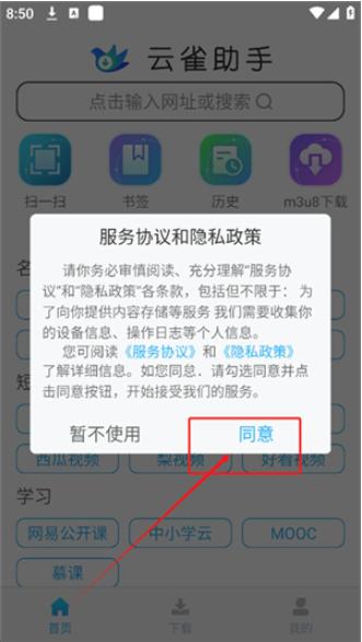 2、首次使用需点击同意隐私政策,确保合法合规使用。