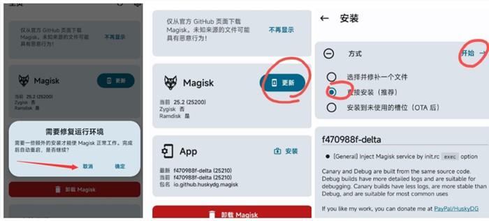 如果你已经刷入了正式版本magisk或者阿尔法版本,想使用magisk_Delta德尔塔版本,只需要下载magisk_delta.apk安装到你的手机,会自动弹窗请求root权限。然后我们点击第一个安装按钮,选择直接安装(推荐),点击开始按钮,就自动刷入magisk_Delta德尔塔啦,成功后直接重启手机,删除之前的magisk,德尔塔就切换成功了。同理,如果你想切换回正式版本面具,也可以一样的操作回到之前想要的任意版本magisk