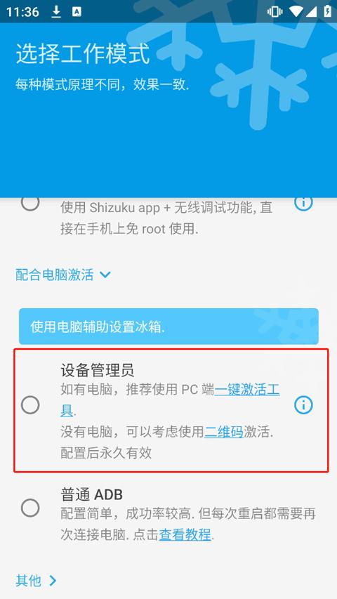 没有 Root的设备,请按照应用说明中的步骤,连接电脑使用 adb 激活一次,即可永久使用,只要不卸载冰箱,重启刷机都可以用。