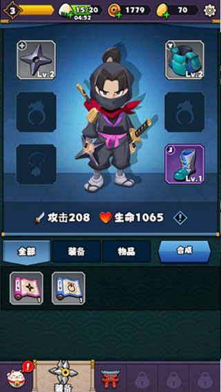 2、你要体验并升级自己的装备和天赋,还要在挑战中更游刃有余的进行战斗,是一部设计了全新题材的游戏,玩家将能见证完全不一样的游戏内容,而且还能掌控飞镖并拯救被魔王霸占的的村庄,你在其中要拿起手里剑和系统中琳琅满目的装备和神器。除此之外还要运用自己目不暇接的忍术和禁术。