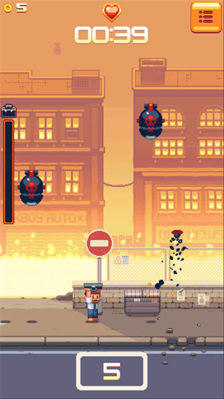 1、玩家需要使用躲避炸弹的攻击,游戏内容丰富,游戏画风简单,关卡多,可玩性高,你还在等什么。2、游戏采用像素化风格,画面卡通,操作简单。玩家需要使用包包保护自己,左右移动以避免炸弹落下。