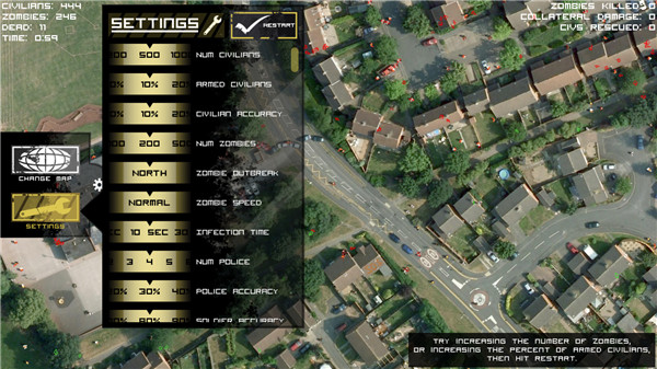 3、通过游戏左边可以调节游戏难易度以及僵尸和人类的强度。