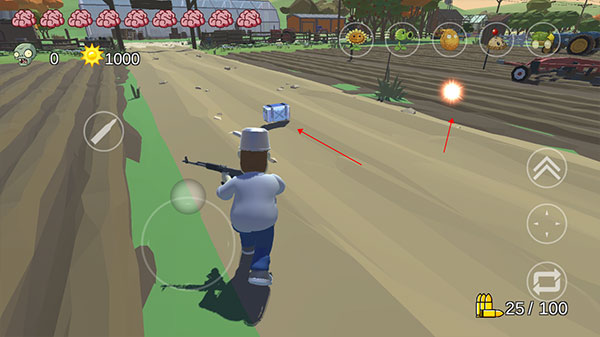 5、还可以利用手中的枪来攻击僵尸,天上会随机掉落阳光和弹药,靠近即可拾取。