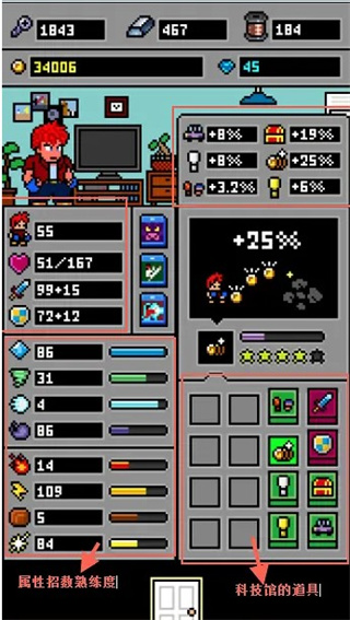 科技馆:科技耗费比较大,建议前期先购买刀剑,增加攻击和防御,每次只能选择一种道具参与战斗,道具一起参与战斗的可以增加道具经验值,每个道具一共有五星,每增加一星就可以提升能力;没有参加战斗的道具同样会提供属性值;