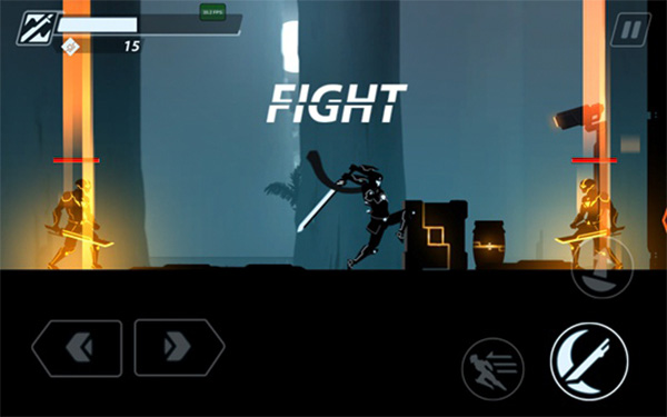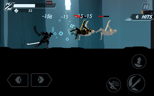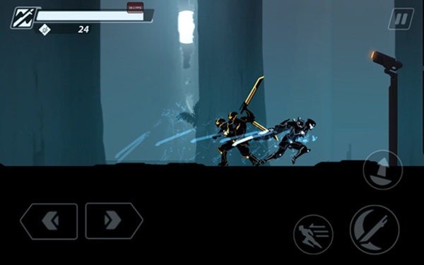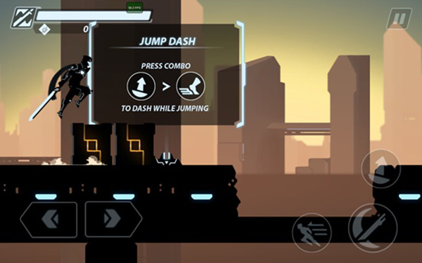 1、进入超速暗影忍者复仇游戏后我们就开始直接跳转,屏幕左下角两个按钮控制主角左右移动,右下角则有攻击、跳跃、瞬移按钮,点击即可控制战斗。