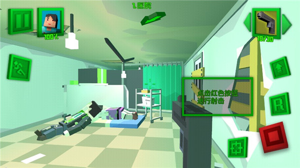 4、点击红色按钮就可以射击僵尸,上方还可以切换武器,但是武器需要自己拾取;