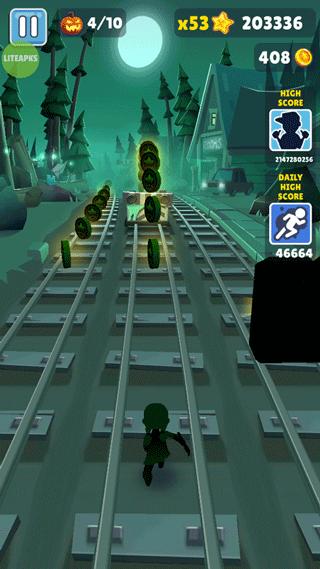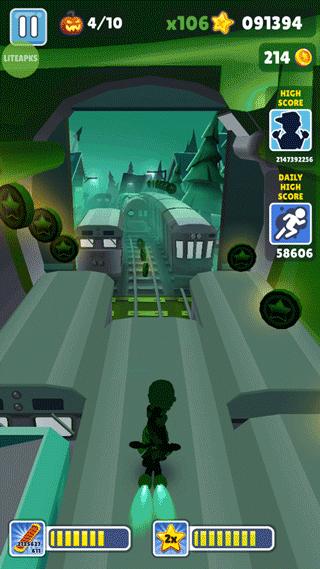 地铁跑酷皮瓜魔改鬼屋liteapks菜单是大神制作的地铁跑酷魔改版本,整个地图都修改为了绿色的鬼屋风格,非常符合万圣节的氛围。地铁跑酷,是一款类似于Temple Run的跑酷游戏。玩家需要通过滑动屏幕左右移动、跳跃和滑行等手势操作,来躲避障碍物、收集金币和道具等。游戏采用自由奔跑的方式,通过众多场景的切换和变化,让玩家尽情体验奔跑的畅快感。游戏的特色在于玩家可以通过金币购买不同形态的人物角色,每个角色有独特的能力和技能,比如血量增强、更快速的奔跑速度、更远的跳跃距离等。除了人物角色,游戏还设有各种各样的装备道具,多种变化的游戏地形和障碍物等元素,让游戏更具挑战性和可玩性。感兴趣的朋友快在本站下载吧!