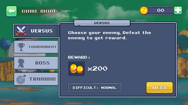 2、这里有四种模式,从上到下分别是VERSUS对抗赛、TOURNAMENT锦标赛、BOSS精英赛、TRAINING训练赛,我们点击【NEXT】开始一局对抗赛。