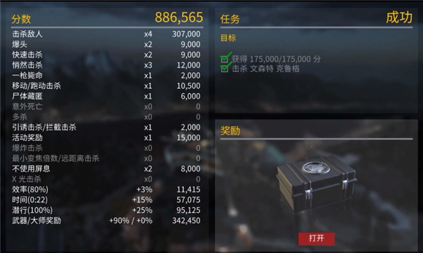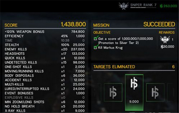 单纯刷分的一个关卡,使用分数加成最高的武器,连续的爆头击杀和秘密击杀,下图是小编的过关的分值结构,枪支使用的是NARCISSUS(6级)。