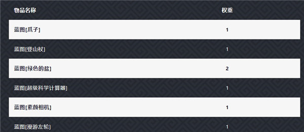 其他掉落物分为三个等级,均包含若干材料、蓝图、种子。当抽取到“其他掉落物”时会先抽取其中一个等级,再抽取掉落物类型(材料、蓝图、种子),最后根据该类型下各个物品的权重得到最终结果。对于每个等级的“其他掉落物”,如果其中包含玩家还未获取到的蓝图,获取蓝图、种子、材料的概率分别为30%、35%、35%;如果玩家获取了所有的蓝图,获取蓝图、种子、材料的概率分别是0、50%、50%。对于特定掉落物获取概率计算公式如下: