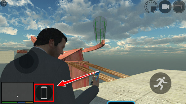 1、双击打开洛杉矶犯罪游戏,点击屏幕左下角地图旁边的手机图标,调出手机菜单;