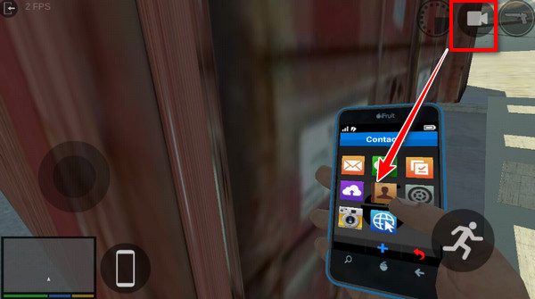 2、建议切换到第一人称更方便看手机菜单,我们点击这里手机中的通讯录图标;