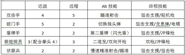 5、侦察兵会无声开锁。独有第二装备可以给敌人“点灯”。个人认为其辅助能力被闪光盾全面压制,其持有的冲锋枪杀伤力极差,技能固然多但本人不认为其价值不可替代。因此本人只牺牲了这一个角色的点数,24个通用技能点都是他贡献的。实际也可以从攻击手那拿一个技能点给侦察兵。终极技能狙击枪需要瞄准一段时间才能提高伤害,可以打击不在同一水平面的敌人,但不适合近距离战斗。